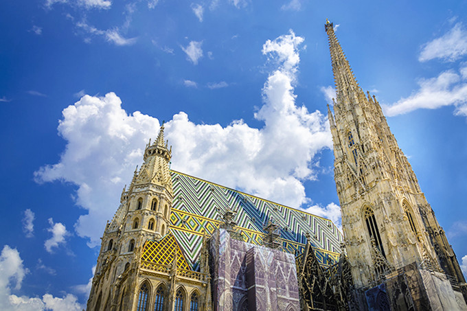 ウィーン旧市街のほぼ中心にあり、ひときわ高い尖塔をもつ教会。23万枚のタイルで作られた美しいモザイクの屋根も特徴的です。ハプスブルク家の墓所であり、モーツァルトの結婚式も葬儀もここで行われたとか。ミサをやっていない時間であれば、中を見学することもできます。 最も高い南塔の展望台からはウィーンの街が一望できますが、343段の螺旋階段を登る必要があるため、手軽に上に登りたい場合は、エレベーターが付いている北塔に登るのもおすすめです。