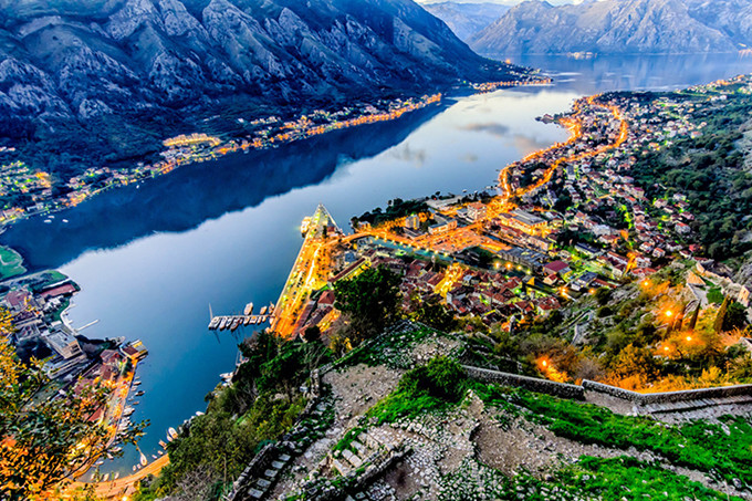 モンテネグロにあるコトルは、古いアドリア海の城砦都市のひとつで、複雑に入り組んだ湾の形状が特徴的。波がなく静かな湾と、その向こうに広がる山の景色はさながら北欧のフィヨルドのようで、オレンジ色の屋根と石組みの街並みとの組み合わせがとても美しい独特の景色を作り出しています。
