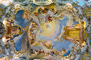 この教会の内部は外観からは想像もつかない華やかな装飾に満ちていて、緻密に描かれた天井画は必見で、「天から降ってきた宝石」とも讃えられています。