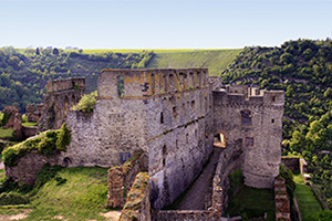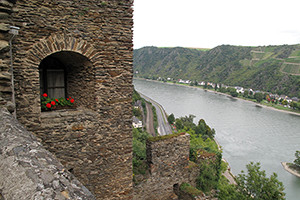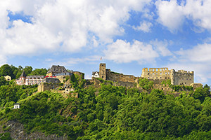 見所は街からも見える、丘の上に建つ「ラインフェルス城」。このお城はライン川流域に数多く残る古城の中でもかなり規模の大きな城です。現在では廃墟となってしまった城の内部にも入って見学することができます。このラインフェルス城は比較的新しい建物部分がホテルとしても営業しており、宿泊の他、レストランで食事やビールを楽しむこともできます。テラス席は街とライン川、その向こうの丘陵を一望する事ができる絶好の展望スポットになっています。