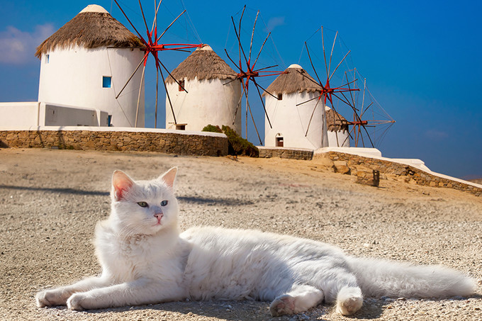ミコノス島にはたくさんの風車があり、サントリーニ島とはまた違った趣のある絶景を作り出しています。歩いていればネコに当たるとも呼ばれるほどネコがたくさんいる島です。自由にのんびりと暮らす猫たちの姿に癒されながらゆっくりとした時間を過ごすことができます。