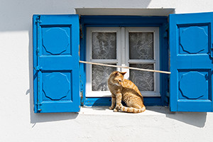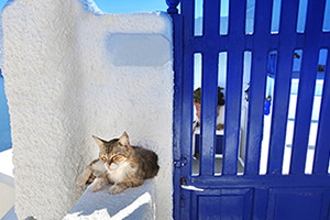 サントリーニ島は、青いドーム屋根を持つ白壁の教会や家々が立ち並び、キラキラと輝く紺碧の海に囲まれた人気の観光。この島では、猫が家を守る動物として愛され、実に伸びやかに、自由気ままに振る舞っています。人に慣れている猫も多く、近寄っても特に怖がることなく写真を撮らせてくれます。