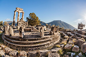 かつてのギリシャにおいて、政治を左右するほどの力をもった信託を授かる場所として、宗教の中心地であったのが「デルフィ」。今では石の祭壇や神殿の跡が残るのみですが、実際にそこに立ってみると当時の美しい神殿の姿が映し出されるようで、神聖な雰囲気に包まれます。当時の人々が神への感謝の印として贈っていた、ブロンズのスフィンクスや様々な像、捧げ物の数々は、現在デルフィの博物館で見ることができます。