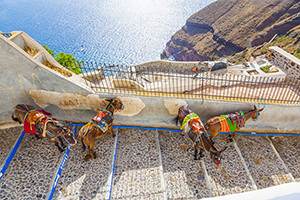 サントリーニ島の玄関口の街。お土産店からバー、絶景を望むレストランまで多種多様なお店が軒を連ねます。断崖絶壁に白い壁と青い屋根の建物が続き、まさにエーゲ海リゾートのイメージそのままの美しい景色が広がります。サンセットの時間はエーゲ海に沈む夕陽が白い街をオレンジ色に染め、とてもロマンティックです。また、港から崖の上までロバの背に乗って揺られながら急斜面を登っていく(または降っていく)体験は、フィラでは外せないことのひとつです。
