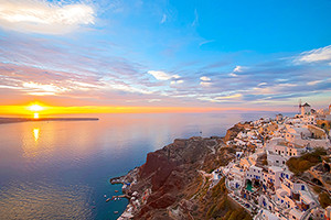 ハネムーナーに絶大な人気を誇る、エーゲ海に浮かぶロマンティックな島。白い壁の家々と青い海のコントラストが美しい。