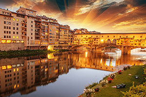 フィレンツェの街を流れるアルノ川にかかるフィレンツェ最古の橋。過去に何度か架け替えがされたものの、現在の橋は14世紀に架けられたものです。長い年月のうちに増築を繰り返し、現在では橋の上にたくさんの店が並んでいます。橋から建物がはみ出すように不規則に並んでいる様はとてもユニークで、フィレンツェの人気写真スポットにもなっています。夜には綺麗にライトアップされ、両岸の街並みや川に映る橋の灯りなどが美しく、昼間とはまた違う雰囲気が楽しめます。