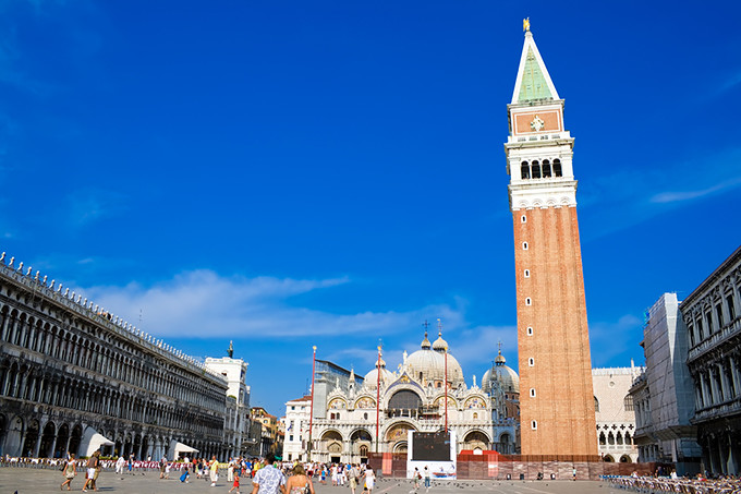 ベネチアの中心地。かつてナポレオンが「世界で一番美しい広場」と称したとも言われており、その美しさはヨーロッパでも随一。ほとんどの観光スポットがこのサンマルコ広場から徒歩圏内となっており、初めてベネチアを訪れた方はまずここを目指すと分かりやすいでしょう。広場には、聖人「聖マルコ」の遺体が納められている大聖堂「サン・マルコ寺院」や、高さ98mの鐘楼があり、いずれもベネチアの人気観光スポットとなっています。