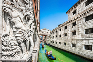創建が8世紀と古いため、イスラム建築に代表される細やかな装飾が随所に見られます。政治の中心として機能していた建物だけあって、内部は豪華絢爛。ベネチア繁栄の歴史を感じる事ができます。また運河を隔てた対岸の牢獄と「ため息橋」という橋で結ばれていますが、ベネチア名物のゴンドラでこの下を通るルートが人気で、”恋人同士がこの橋の下で日没時にゴンドラに乗ってキスをすると永遠の愛が約束される”と言われています。