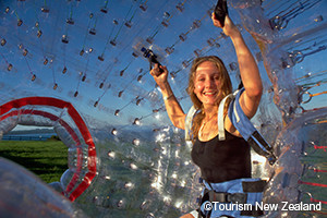 OGOは、簡単にいうと、空気で膨らませた巨大なボールの中に入って、丘の上から、まるでボールを転がすように下っていくアクティビティ。画像にもあるように、大きなボールは2重構造になっていて、内側のボールの中に人間が入ります。2つのコースがあり、真直ぐに下っていくコース(約250m)では、ジェットコースター並のスピード感。もう一つのジグザグコース(約350m)では、どちらの方向に転がるか予想もつかないため、ボールの中でいろいろな方向に転がります。