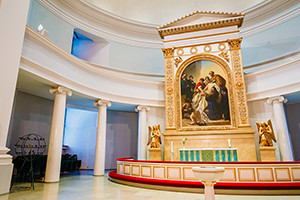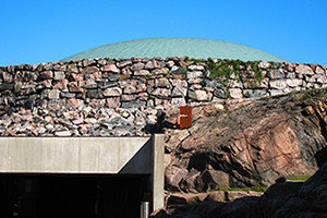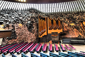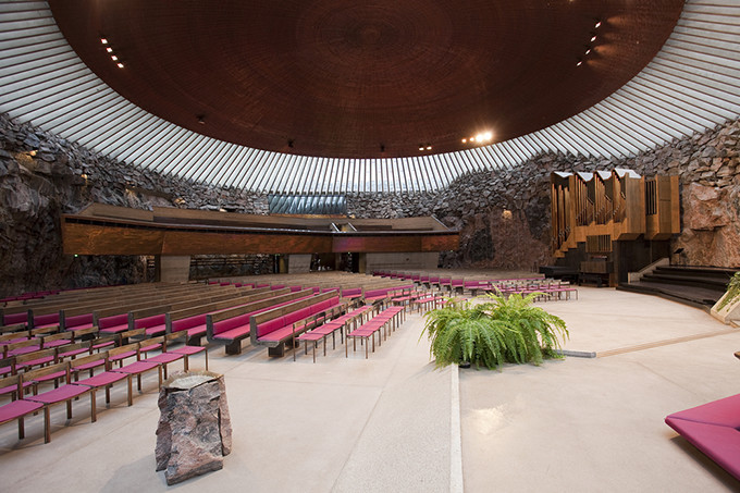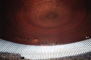 氷河期から残る天然の岩をくり抜いて作られた岩の教会。外部から見ると単なる岩山にドーム屋根が見えているだけで、教会とは気付かないほどですが、中に入ると全く別の景色が広がっています。教会内部の壁はくり抜かれた天然の岩がそのまま使われており、剥き出しになった岩肌の壁と、頭上を覆う木目の大きな天井が室内を包み、そこにリボン状のスリットから地上の光が降りそそぎ、とても神秘的な雰囲気を醸し出しています。