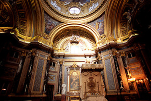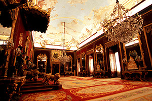 西ヨーロッパで最大規模を誇る王室の宮殿。2,800もの部屋がある巨大な宮殿ですが一般に公開されている部屋もあり、一番の見所は「王位の間」。黄金色の室内、貴重な絵画作品で飾られた真紅の壁と絨毯、輝くクリスタルのシャンデリアと、目もくらむようなきらびやかな部屋で、当時の栄華がしのばれます。他にも、金や銀などで装飾された各年代の貴重な本が収蔵された図書館、王家の武具のコレクションなど、スペイン王家の数々の展示品を見る事ができます。