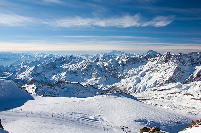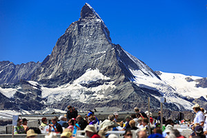 ツェルマットの街から登山鉄道に乗って気軽に訪れることができる展望台。マッターホルンはもちろんのこと、モンテ・ローザをはじめ4,000m級の山々と、その足元を流れるゴルナー氷河などを一望することができます。展望スポットは主に2つあり、駅に到着してすぐの展望台がお手軽ですが、常に人でいっぱいなのがちょっと難点。少し歩いて尾根の頂上まで行くと、比較的ゆっくりと楽しむことができます。展望台にはホテルレストランもあり、名山を眺めながらのお食事も楽しめます。