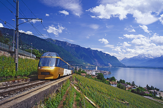 ルツェルン湖とレマン湖を結ぶ、スイス中央を横断するルート。沿線には氷河の雪解け水を集めた美しい湖や、雄大なアルプスの山並み、ワインを生み出すブドウの棚田など、スイスらしい車窓が続きます。どこまでも緑が広がる牧歌的な沿線は、もうひとつの魅力あふれるスイスの景観といえます。普段は運転席の場所である先頭車両の一番前の席に設けられたパノラミックVIP席があるのも特徴の一つで、ダイナミックな景色が楽しめると、人気の席になっています。