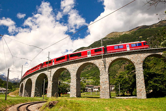 ツェルマットから、冬季オリンピックの会場にもなったサンモリッツまでを結ぶ、スイスを代表する観光鉄道。列車は窓が大きく開けたパノラマ車両が連結されており、アルプスの名峰、美しい森や牧草地、山間の急流や渓谷などの絶景を堪能する事ができます。見所の一つは、クール~サンモリッツ間に現れる、長さ136m、高さ65mの「ランドヴァッサー橋」。大きく湾曲したその橋に列車が差し掛かると、赤い列車が優雅にアーチを描き、絶好の写真スポットとなります。