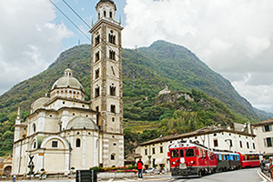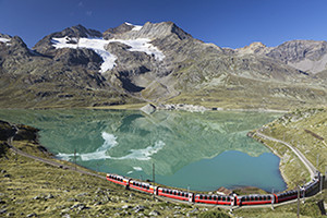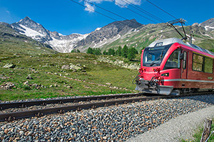 サン・モリッツとイタリアの国境駅ティラノを結ぶルート。2時間半程度の短い時間の中で1,800mもの高低差を進む、ダイナミックな景色の変化が特徴で、鉄道路線自体が世界遺産にも登録されている景勝ルートです。気軽に途中下車ができる事も魅力のひとつで、降りた駅からロープウェーなどを使い展望台までアクセスすれば、氷河や4,000m級のアルプスの山々を眺めることができます。途中通過するループ橋も特徴的で、絶好の写真スポットになっています。